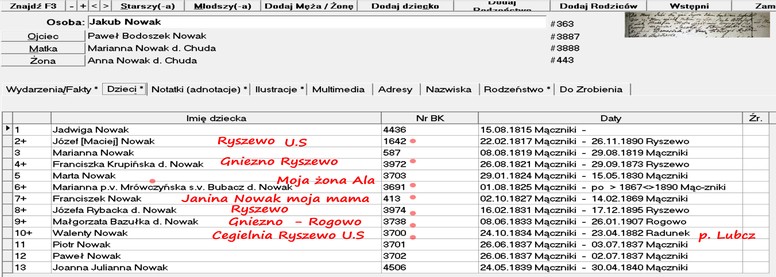 Nowak. Family connections from Jakub Nowak 1790 - 1849 & Anna Nowak d. Chuda 1792-1885 Mączniki parish Sokolniki & Gniezno St. Peter & Paul. My distant cousin from the USA